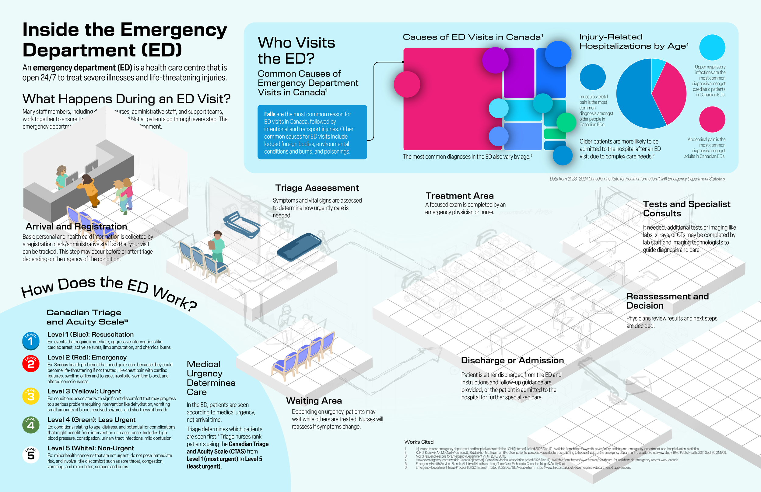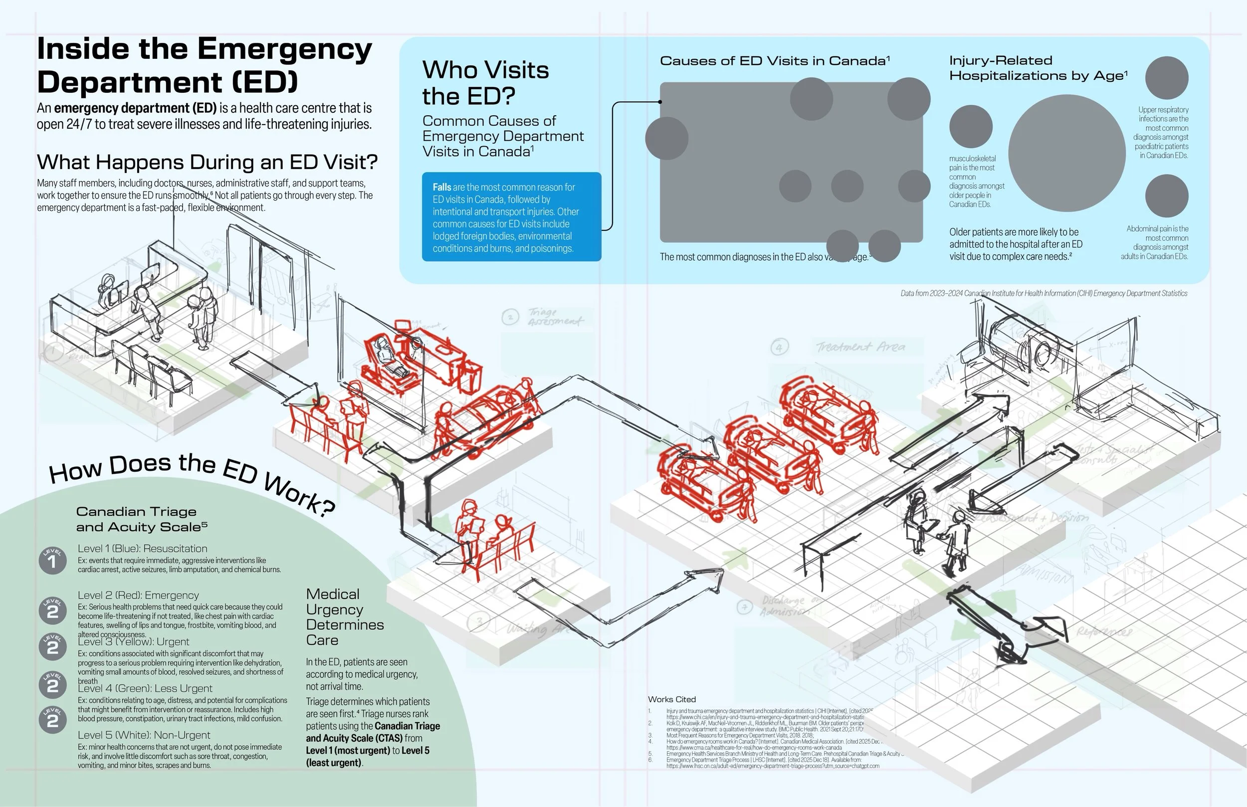 This project aims to demystify how a typical Canadian emergency department works through a patient-oriented perspective. It outlines the general treatment pathway to help patients better understand what their care experience may look like once they enter the ED, and how the Canadian Triage and Acuity System (CTAS) works to prioritize conditions based on severity.