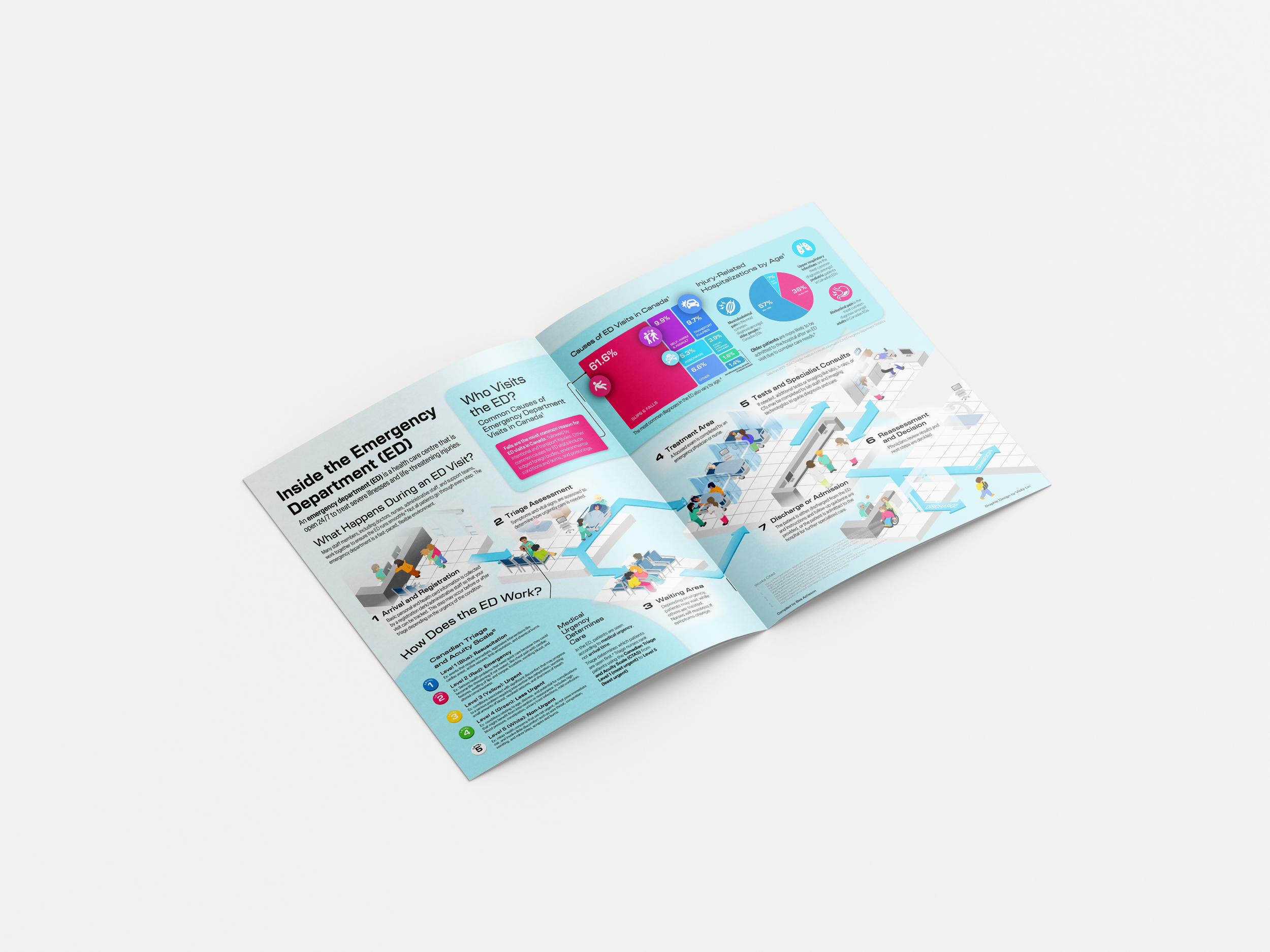 In collaboration with IMS Magazine writer Bea Acheson, this two-page infographic magazine spread describes how a typical Canadian emergency department operates while highlighting common causes of hospitalization across different demographics.
