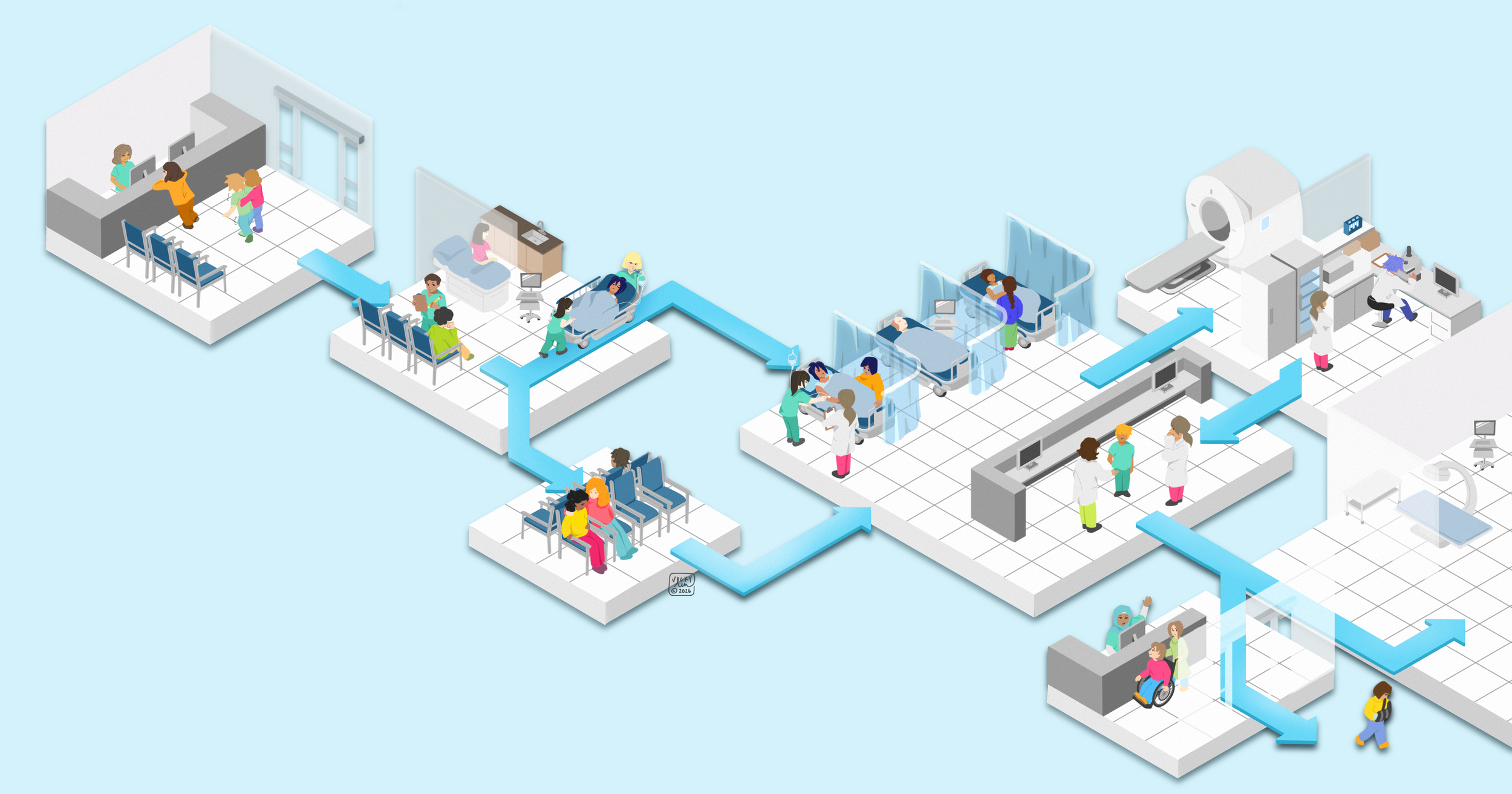 Each step is illustrated as an isometric platform where patients and healthcare staff interact to reflect the dynamics of a real hospital environment. This approach also highlights the various ED professionals who work together to ensure patients receive appropriate care. At the same time, I opted for a simpler colour-blocking style to illustrate the figures shown to create a more personable and friendly design.